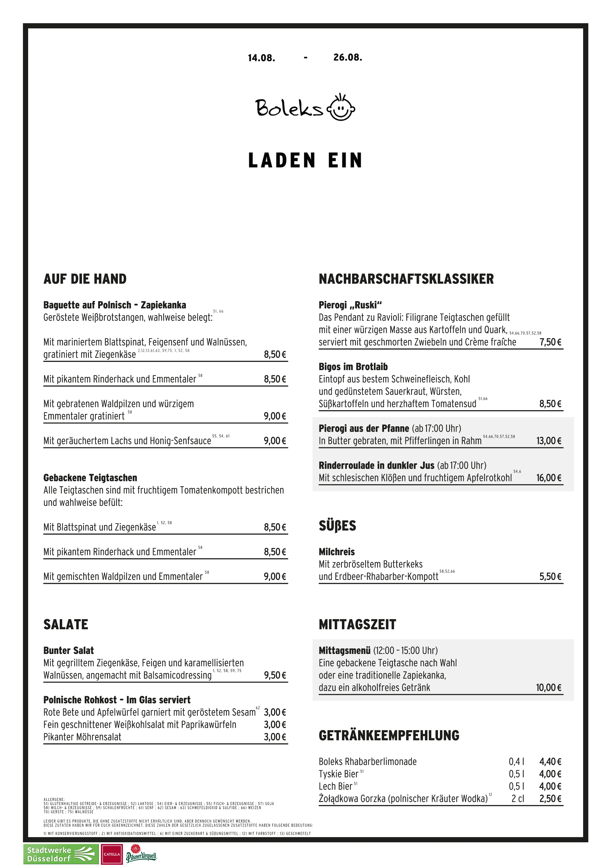 Für zwei Wochen duftet der LADEN EIN nach in Butter geschwenkten Piroggen, die mit frischen Pfifferlingen serviert werden. Diese kleinen Teigtaschen sind immer wieder eine geschmackliche Wucht und eine leckere Alternative zu den altbekannten Raviolis! Aber die Karte hat noch mehr zu bieten und für den kleinen und großen Hunger wird hier jeder fündig. Ob deftige Hauptspeisen oder polnische Weißbrotstangen Zapiekanka belegt mit Lachs, pikantem Rinderhack vom preußischen Ochsen oder vegetarisch mit Blattspinat, Feigensenf und Walnüssen. Unter anderem gibt es Bigos im Brotleib, Rinderrouladen mit Klößen und Apfelrotkohl und bunten knackigen Salaten. Wir wünschen guten Appetit – Smacznego!