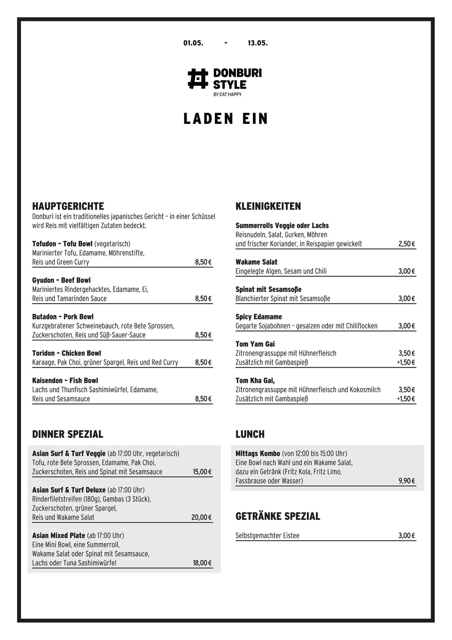 Donburi ist ein traditionelles japanisches Gericht - In einer Schüssel wird Reis mit den verschiedensten Zutaten bedeckt. Bei dieser Interpretation des Donburi Stils gibt es zum Beispiel leckeren Schweinbauch oder Karaage zusammen mit Tamarinden Sauce und leckerem knackigem Gemüse. Aber auch Fischliebhaber kommen mit Lachs oder Thunfisch als Bowl-Topping voll auf ihre Kosten. Abends könnt ihr dann aufwendigere Varianten dieses Klassikers genießen. Dann heißt es „Asian Surf and Turf Deluxe“ zum Beispiel Rinderfilet, Gambas und grüner Spargel. Kommt vorbei und genießt die feine asiatische Küche.