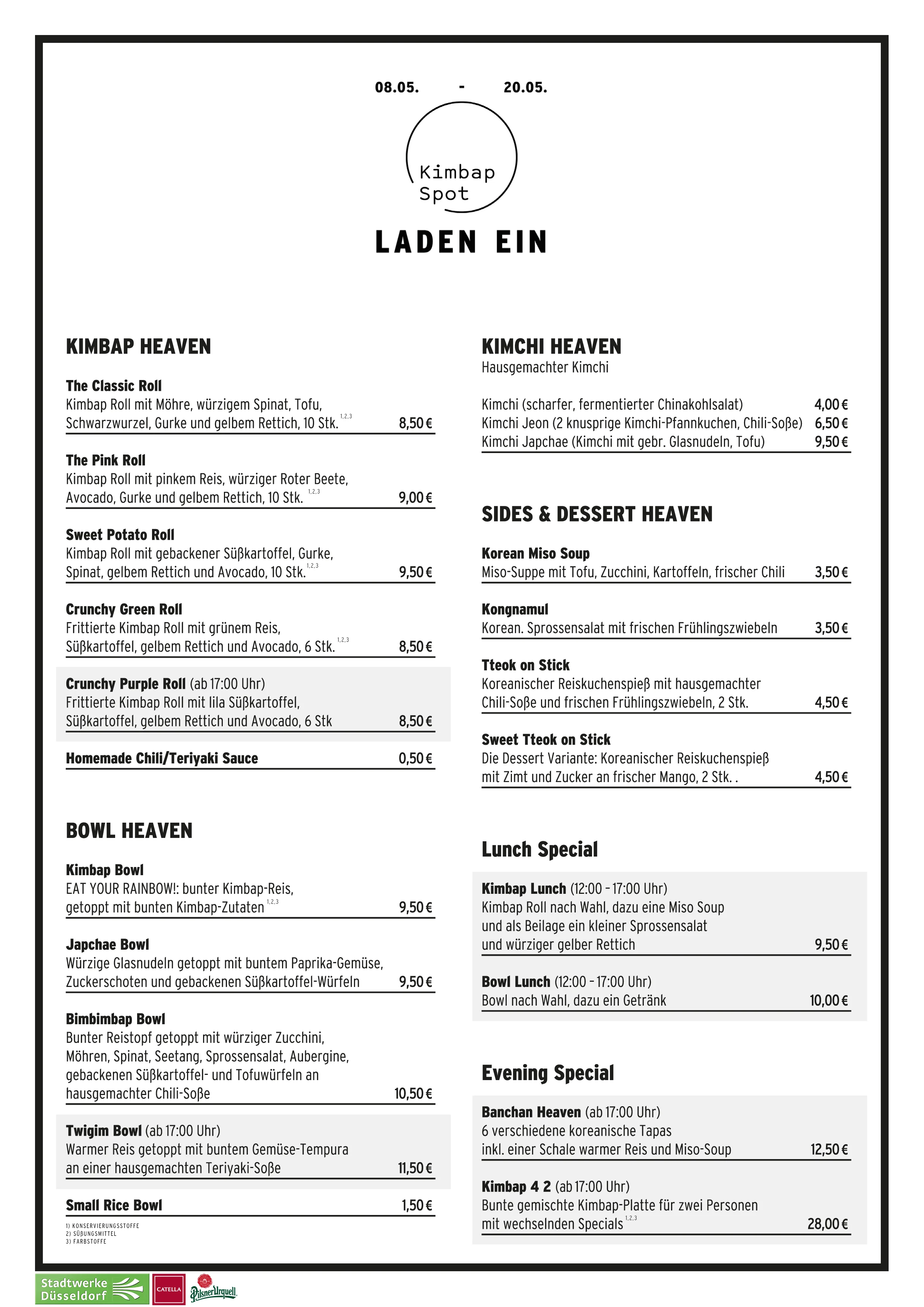 Kimbap Spot bedeutet Korean Soulfood und steht für leckere authentische Küche. Für zwei Wochen zaubern Kimbab Spot bunte Kimbap auf eure Teller. Kimbabp setzt sich zusammen aus zwei koreanischen Wörtern Kim (Seetang) und Bap (gekochter Reis). Die bunten koreanischen Sushi Variationen sind ein purer Genuss! Denn die Rollen werden befüllt mit allerhand bunten Zutaten: Ob mit Gurken, gelbem Rettich, Klettenwurzeln, Spinat, Süßkartoffeln, Tofu oder cremiger Avocado. Alles vegan mit köstlichen saisonalen Zutaten verfeinert. Darüber hinaus stehen Banchan auf der Karte, eine Art koreanische Tapas. Hier habt ihr die Qual der Wahl: Ob Kimchi, eingekochte Bohnen, Mini-Pancakes, Lotusblüten oder kandierte koreanische Walnüsse. COLOURFUL – HANDMADE – PLANTBASED