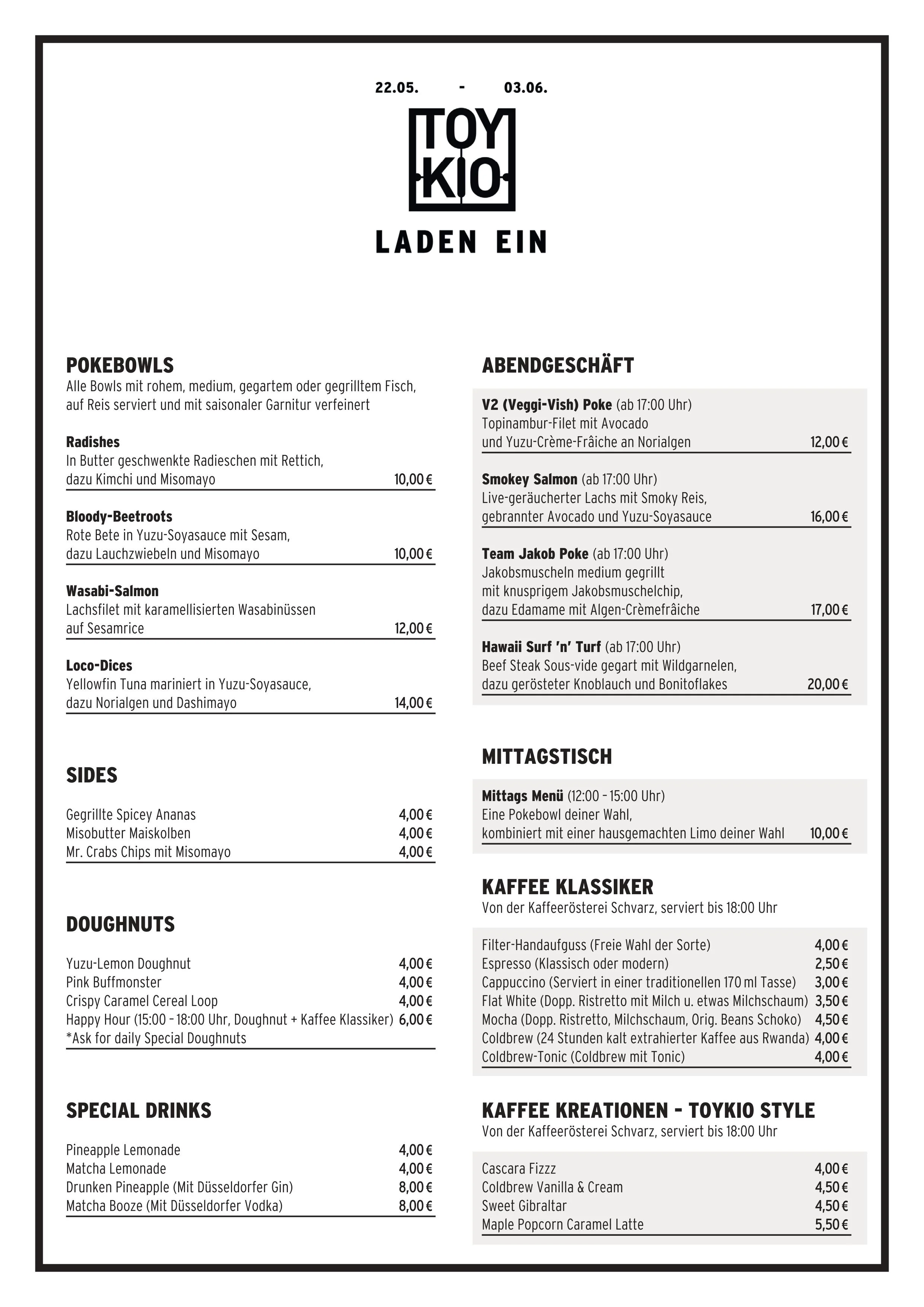 Pokebowls kommen eigentlich aus Hawaii, erleben in L.A. und New York aber seit einiger Zeit einen Megahype. Nun erobern die köstlichen Bowls den LADEN EIN Düsseldorf. Für zwei Wochen könnt Ihr bei Toykio die köstlichen Pokebowls genießen. Ob mit rohem Fisch, knackigem Gemüse, spannende Gewürze und hausgemachten Saucen. Fest steht: Poke ist ein pures Sinnerlebnis. Einfach mal was ganz Neues ausprobieren, das alle Geschmacksnerven triggert und noch dazu gesund und vielfältig ist. Klingt gut, oder?