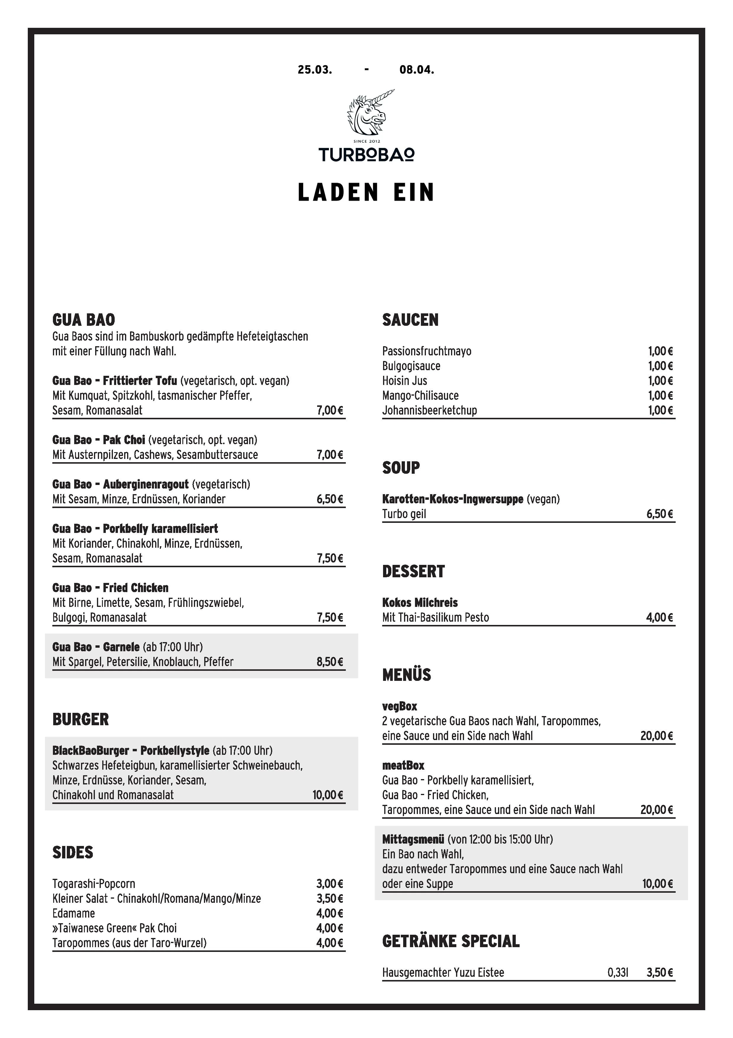 Als erste temporäre Belegung im LADEN EIN Düsseldorf sorgt Turbo Bao vom 25.03.-08.04.2017 für einen geschmacksexplosiven Startschuss. Auf der Karte stehen Gua Baos, eine gefüllte Variante des gedämpften Hefeteiges. Ob mit Pak Choi, Austernpilzen und Cashewsesambutter, zartem Pork Belly oder frittiertem Tofu und salziger Mango ein purer Genuss. On top gibt es gerösteten Sesam, Sprossen, Frühlingszwiebeln, Minze, Nüsse und vieles mehr. Fest steht: Jeder Biss in die fluffigen Hefeteilchen ist ein perfekter Mix aus spannenden Zutaten. Man kann nicht genug kriegen von den bunten Kreationen. Leider machen die kleinen Hefeteilchen doch schneller satt als gedacht. Als Beilagen gibt es Edamame, Togarashi Popcorn oder einen taiwanesischen Pak Choi Salat. Was wäre ein gutes Essen, ohne ein passendes Dessert. Keine Sorge Turbo Bao lässt euch nicht hängen und serviert einen cremigen Kokos-Milchreis mit Thai-Basilikum Pesto. Perfekte Karte um sich passend zur Eröffnung vom Laden Ein - Düsseldorf in der postPOST - Grand Central die Bäuche vollzuschlagen.