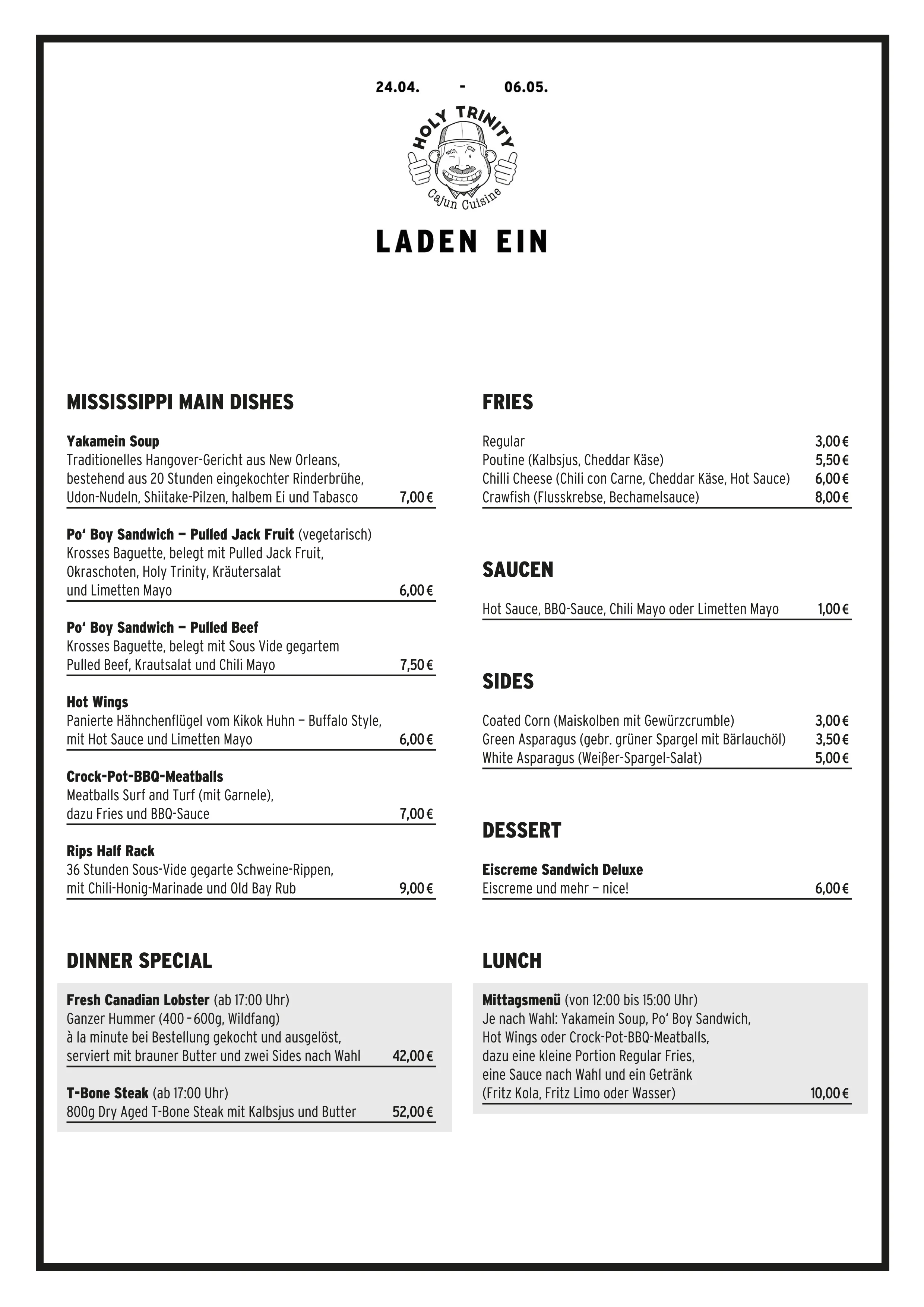 Holy Trinity hat es sich zur Aufgabe gemacht Cajun Cuisine in den LADEN EIN Düsseldorf zu holen. Alle, die in die Geschmackswelten der französisch inspirierten Südstaatenküche eintauchen wollen, sind in der postPOST - Grand Central richtig aufgehoben. Tolle Kreationen und simple Speisen, die perfekt aufeinander abgestimmt sind. Ein köstlich veganes Highlight ist die vegane Gumbo mit Okraschoten und Holy Trinity (Paprika, Staudensellerie, Zwiebel). Frittierte Köstlichkeiten sind in der Cajun-Küche nicht wegzudenken. Hier wird es einige knusprige Überraschungen für Euch geben.